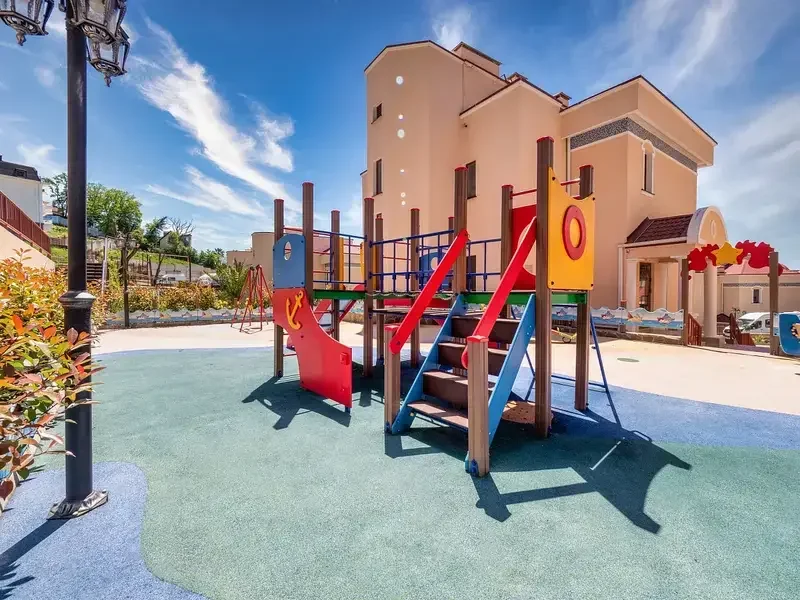 На территории есть детская площадка с безопасным покрытием для активных и веселых игр.